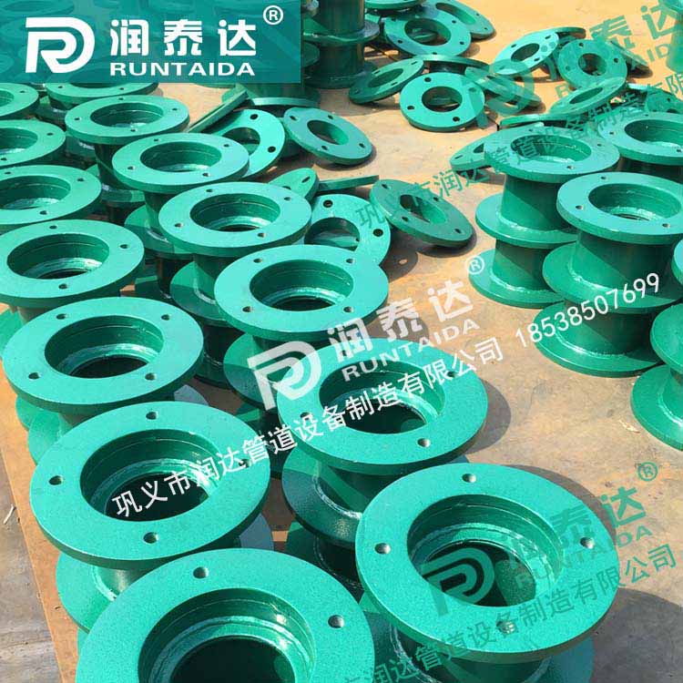 具體組合型式為:柔性防水套管加長后增加擋圈、端部配套法蘭接頭、內(nèi)置柔性橡膠套管。施工分為基層處理和二次灌漿、穿墻管安裝固定、橡膠套管安裝。