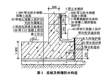 工程設(shè)計(jì)地下室底板厚1 000 mm,強(qiáng)度等級(jí)C35;側(cè)墻厚600 mm,強(qiáng)度等級(jí)為C30,底板與側(cè)墻抗?jié)B等級(jí)均為P10。底板采用3 mm厚濕鋪?zhàn)哉撤浪聿耐夥劳赓N法防水施工,外側(cè)墻采用2.0 mm厚雙組分聚氨酯防水涂料外防法施工,防水設(shè)防等級(jí)為Ⅱ級(jí)。底板及側(cè)墻防水做法,見圖1。