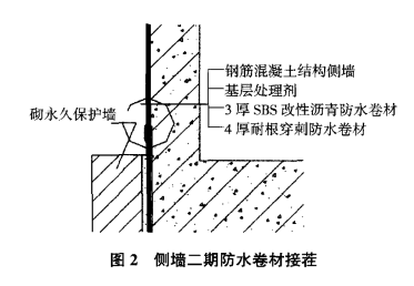 底板部位的卷材與永久性保護(hù)墻的接觸部位應(yīng)空鋪或適當(dāng)點粘(以適應(yīng)結(jié)構(gòu)的不均勻沉降),永久性保護(hù)墻頂面預(yù)留甩茬的卷材上面蓋兩皮磚進(jìn)行臨時保護(hù),待二期接茬時拆掉臨時保護(hù)墻,與外墻卷材進(jìn)行搭接。側(cè)墻二期防水卷材接茬示意見圖2。