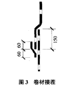 根據(jù)國家規(guī)范GB 50208-2002《地下防水工程質(zhì)量驗收規(guī)范》,底板預(yù)留的甩茬卷材與外墻的卷材搭接接茬寬度不小于150mm,為了在接茬部位將安全保險系數(shù)提到最大,在最外層卷材接茬部位再增加一蓋口條,蓋口條卷材與大面卷材同材質(zhì),同規(guī)格,寬120 mm,見圖3。