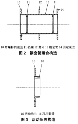 焊接有固定法蘭,管內(nèi)腔設(shè)置兩個(gè)擋圈。帶螺桿的法蘭連接在有套接在穿墻管道上的活動(dòng)壓蓋上。穿墻管道與鋼套管之間于兩個(gè)擋圈外側(cè)分別設(shè)有密封膠圈、柔